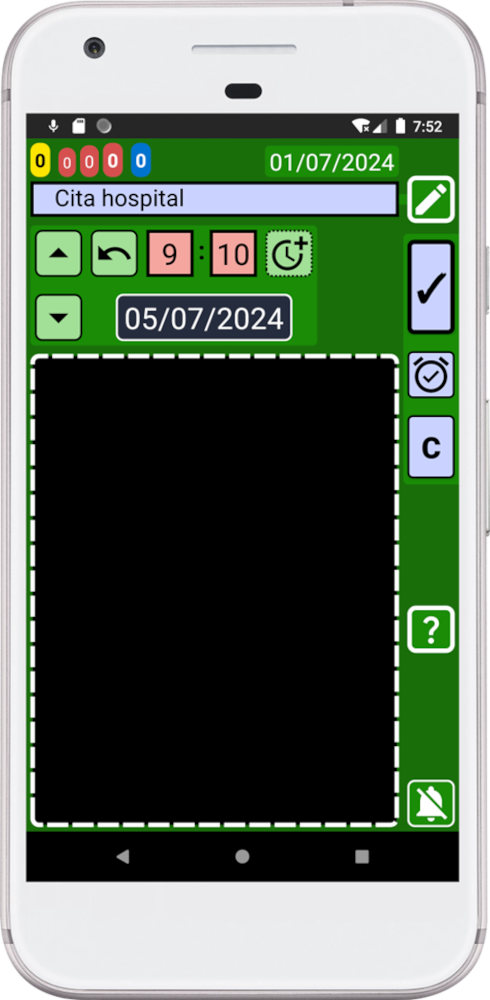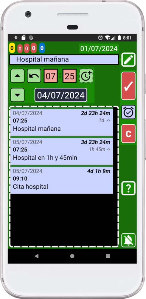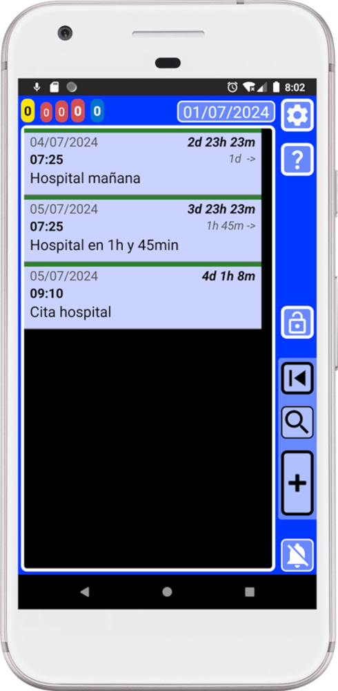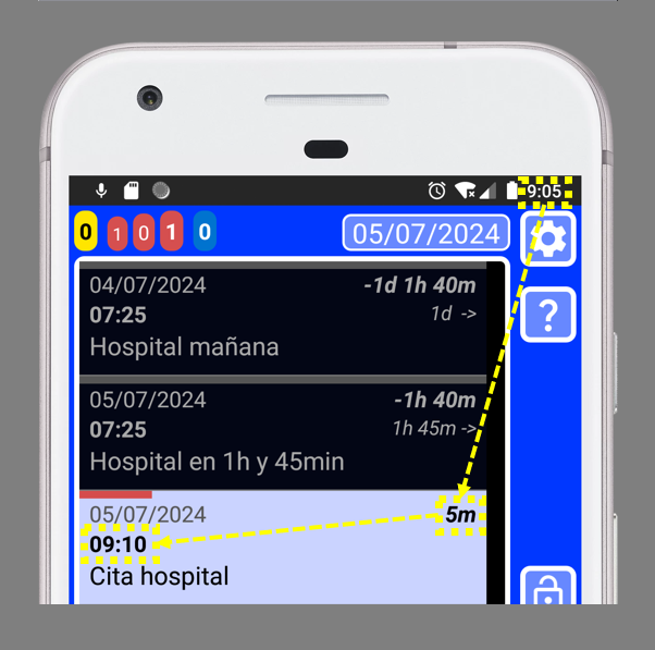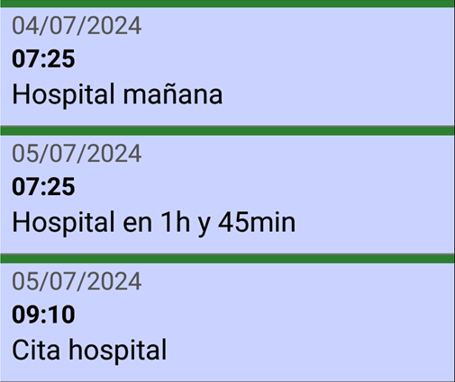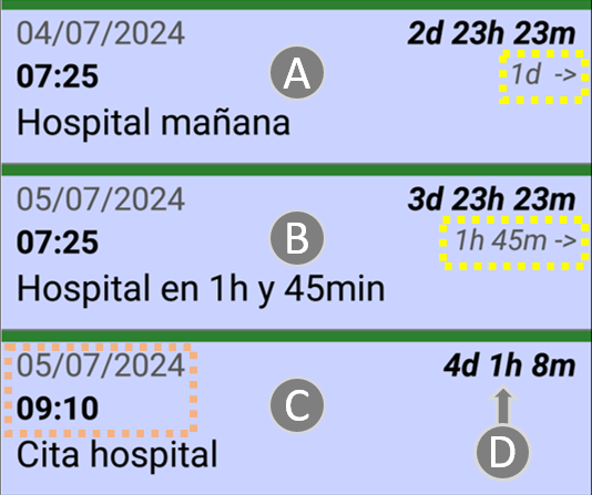 En pocos segundos y sin cálculos mentales que pudieran estar equivocados, creamos todo lo que necesitamos para tener un control total. Hemos creado un registro un día antes (A). Un registro para avisarnos cuando tenemos que salir de casa (B). Decidimos que teníamos que salir de la casa 1h y 45min antes para no llegar tarde, y se puede ver que está correcto. Finalmente, tenemos un registro con la cita en el hospital, nuestro objetivo (C). La hora indicada por (D) cambiará cada minuto, por lo que en cualquier momento sabrás cuánto tiempo te queda para tu cita:
