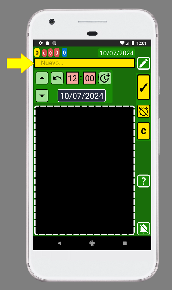 La fecha actual esta en la parte superior de la pantalla (fondo verde). La fecha de nuestro registro esta encima de la lista (fondo azul).