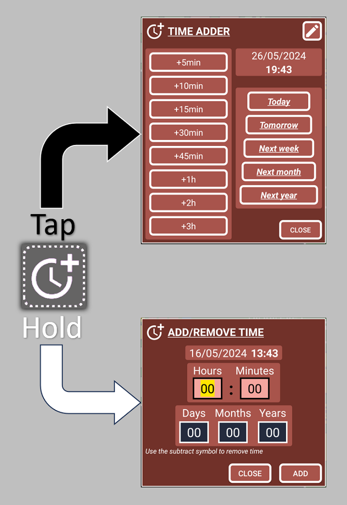 These windows help you to add or subtract time without the possibility of making mistakes when you tap/hold this button