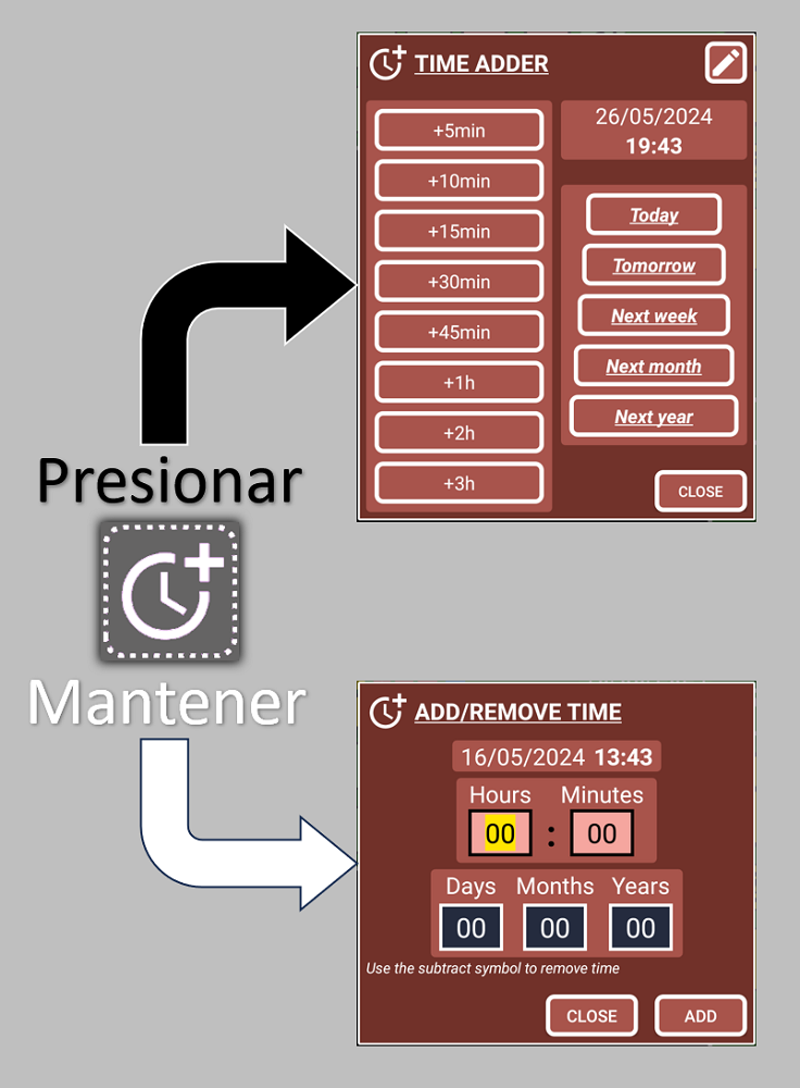 Estas ventanas te ayudan a sumar o restar tiempo sin posibilidad de cometer errores cuando pulsas este botón