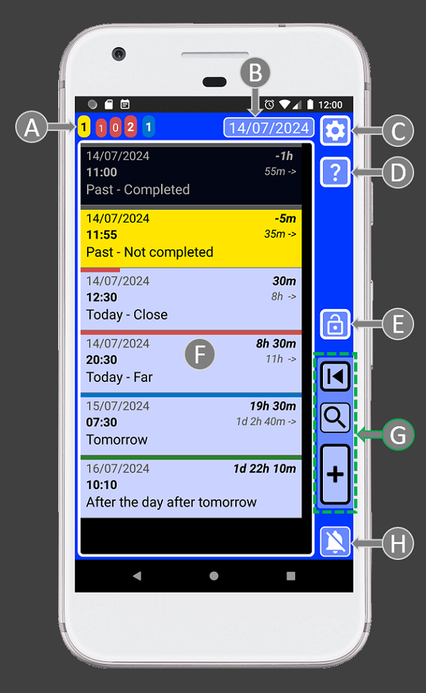C = Record buttons: save, completed/not completed, List/Copy. The List button will be displayed when we edit a record and we did not change its time. Then we can press the button to add the text to create a list. If we edit a record and we change its time, the “L” (list) button will change to “C” (copy). This will allow to create a copy of that record every time we set a different time and we press “C” button.