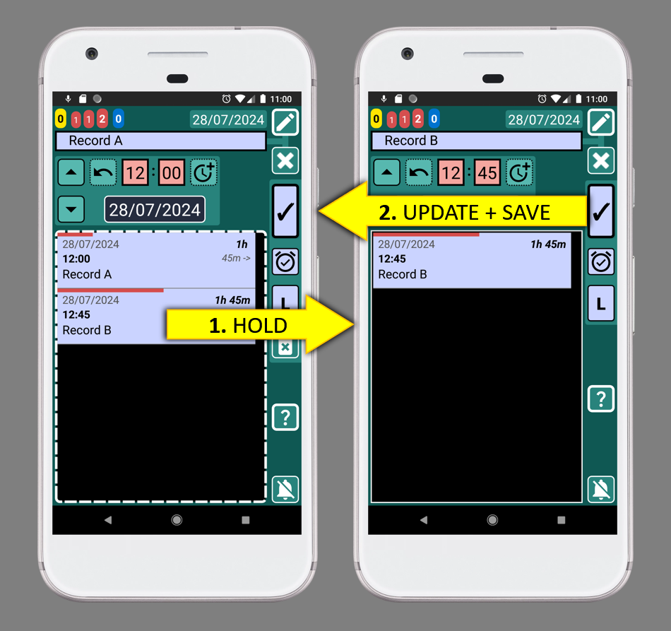 If you are editing “Record A” (left picture) and you notice that you want to change something in “Record B”, you can open it by holding down on "Record B". After making the changes, you can then save it and come back to "Record A".