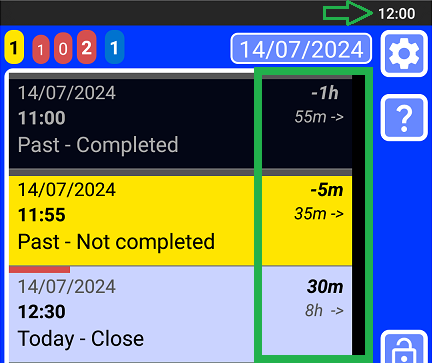 9. The date in the main window (with blue background colour) is a button that allows you to move the list to the yellow record closest to the present. If there are no yellow records, it will move the list to the present to show the next incoming record.