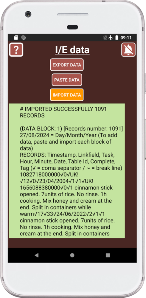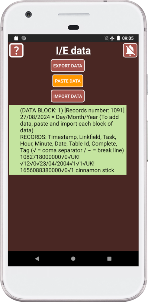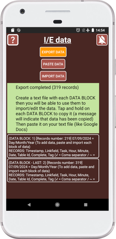 Basically, the Import/Export window is able to transform SECURElogBook information into text (records, Favourite menu's data and user times data). It can also read that text information to recreate records, Favourite menu's data and user times data. So, you can store this text to create backups of your SECURElogBook data.
