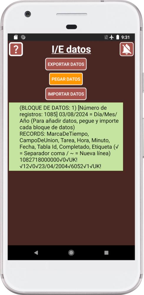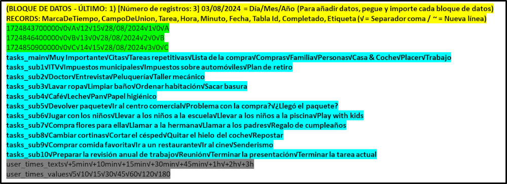 El encabezado del último archivo le indica el número total teórico de registros a importar (“Número de registros = ”). Si presiona el botón EXPORTAR DATOS, el cuadro de texto indicará cuántos registros tiene actualmente. Ambos valores deben coincidir, si no hay registros previos. Si los valores no coinciden es porque tuvimos un problema con el proceso de copiar/pegar. Tal vez olvidó importar un archivo. Tal vez hay un problema con el software utilizado para crear los archivos o el programa de texto no puede copiar toda la información.