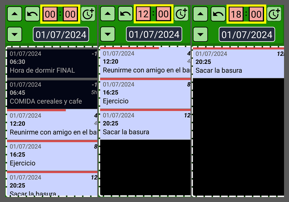 Aquí tenemos la misma lista mostrando los registros cuando cambiamos la hora a las 00:00 (izquierda), 12:00 (medio) y 18:00 (derecha).