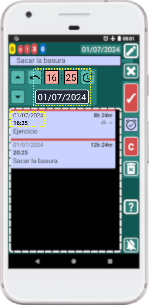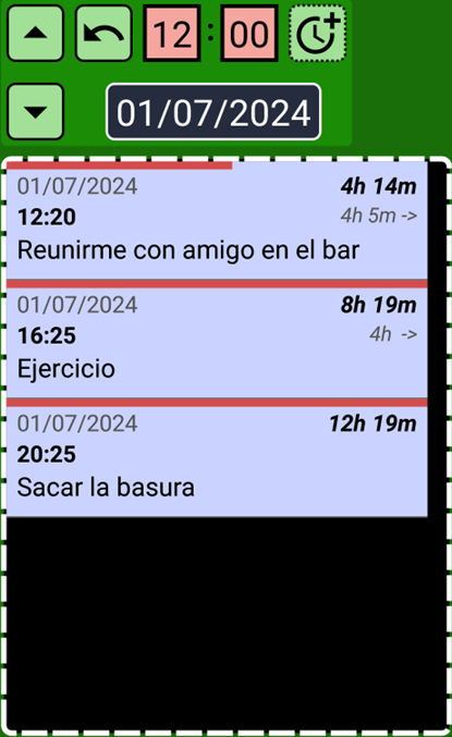 El botón ARRIBA selecciona la hora del registro anterior. El botón ABAJO selecciona la hora del siguiente registro. Estos botones copian la hora del primer registro de la lista y la añaden al registro que estás creando o editando. Luego, cuando ambos registros están en la misma hora, puedes añadir o quitar tiempo para colocar perfectamente el registro que estás creando o editando: