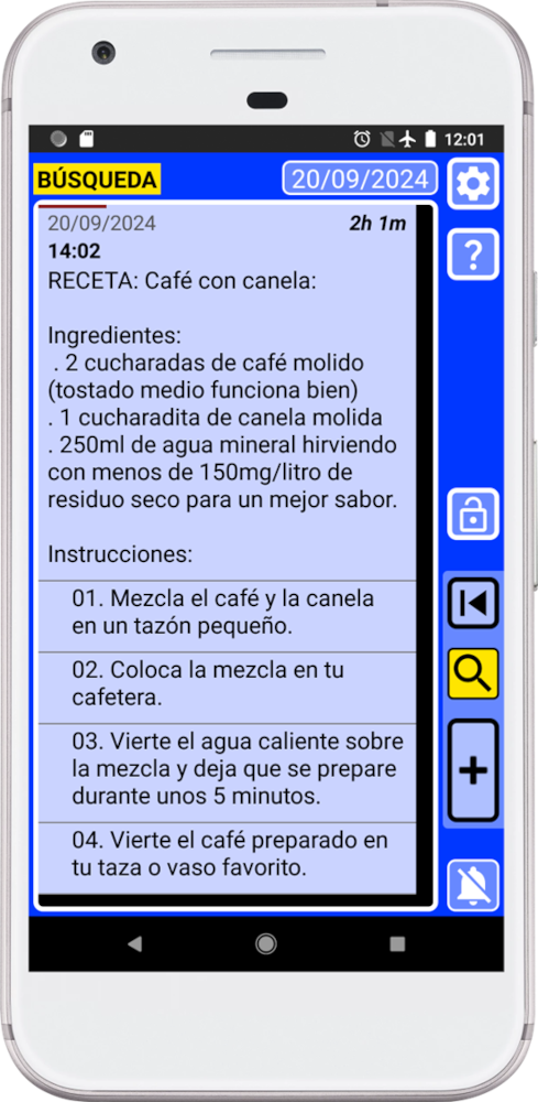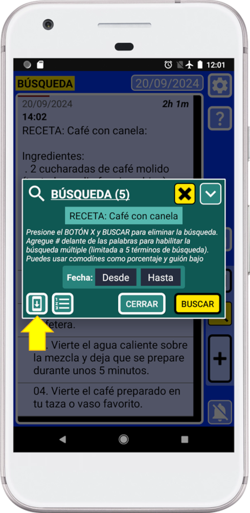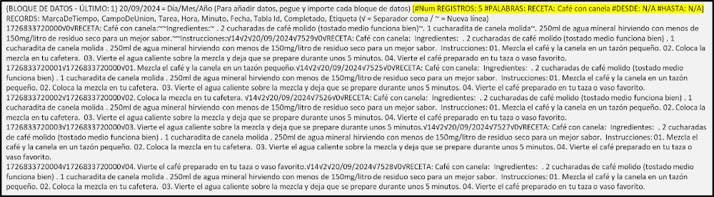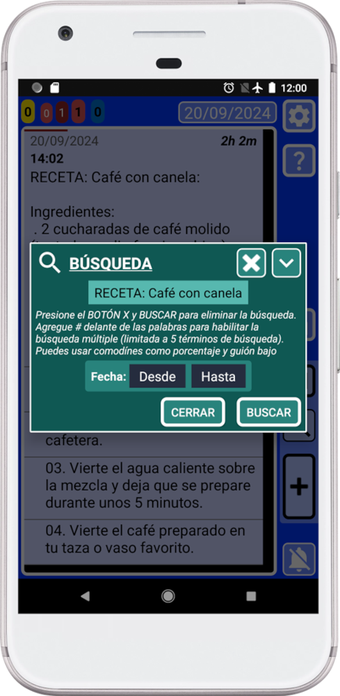 en la ventana principal (azul) y escribe algo que solo esté presente en el/los registro/s que estamos buscando, en este caso “RECETA: Café con canela”:
