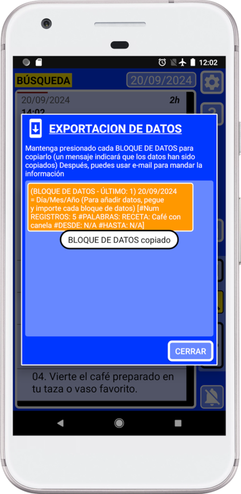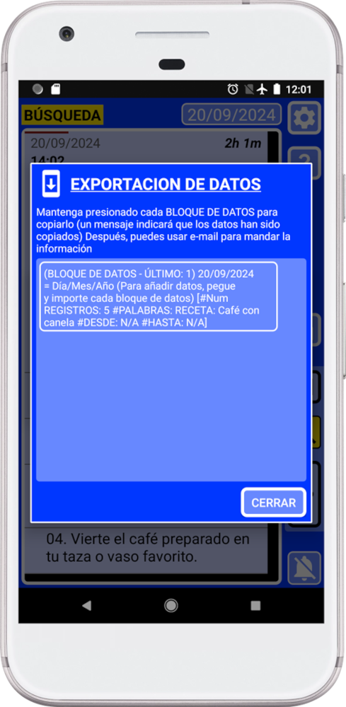 Recuerda que si cierras la ventana de “EXPORTACION DE DATOS”, la información se eliminará del portapapeles para no permitir que otras aplicaciones accedan a tu información.