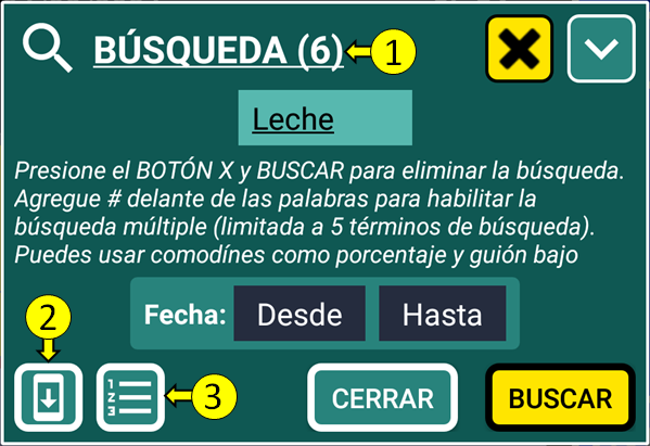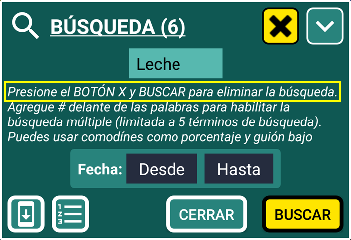 4. Después de presionar el botón “BUSCAR”, la búsqueda indica que se encontraron 6 registros (añadidos al final del título). Pero podemos ver 5 registros que contienen “Leche”. El extra se debe a la lista “Lista de la compra” (en amarillo) donde se encontró “leche”:
