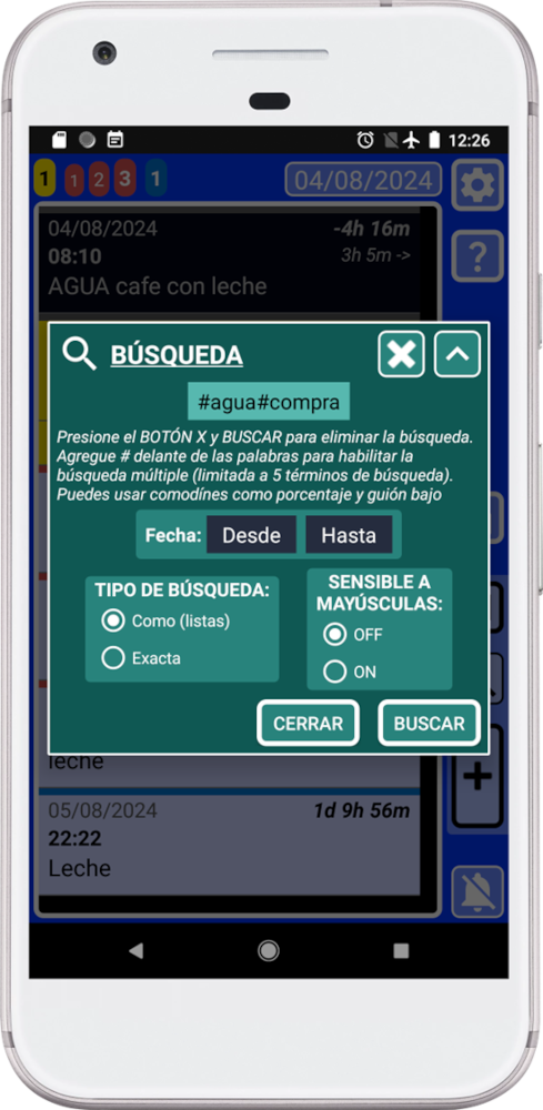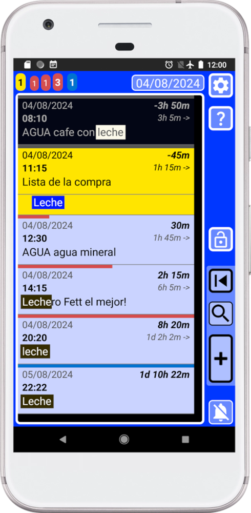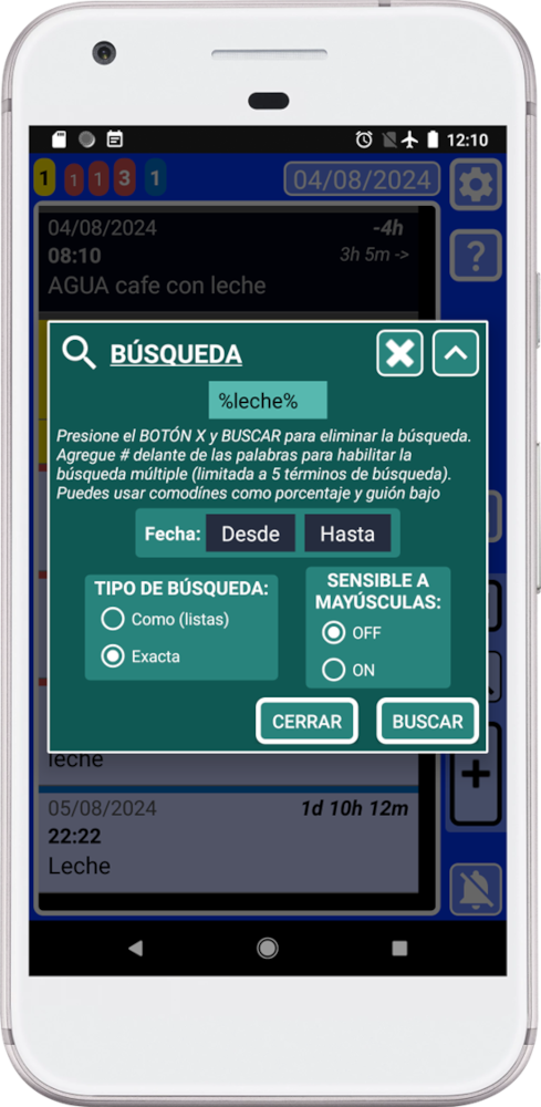 Por defecto, la búsqueda está configurada como una lupa para permitirte encontrar cualquier cosa rápidamente. Por ejemplo, puedes buscar “Leche” y la búsqueda mostrará en la ventana principal (azul) todos los registros que tengan “Leche”. Esto incluso incluirá listas donde se encontró la palabra “Leche” como un artículo. Por defecto, la búsqueda no hace diferenciación entre mayúsculas o minúsculas, por lo que mostrará todo con “leche”.