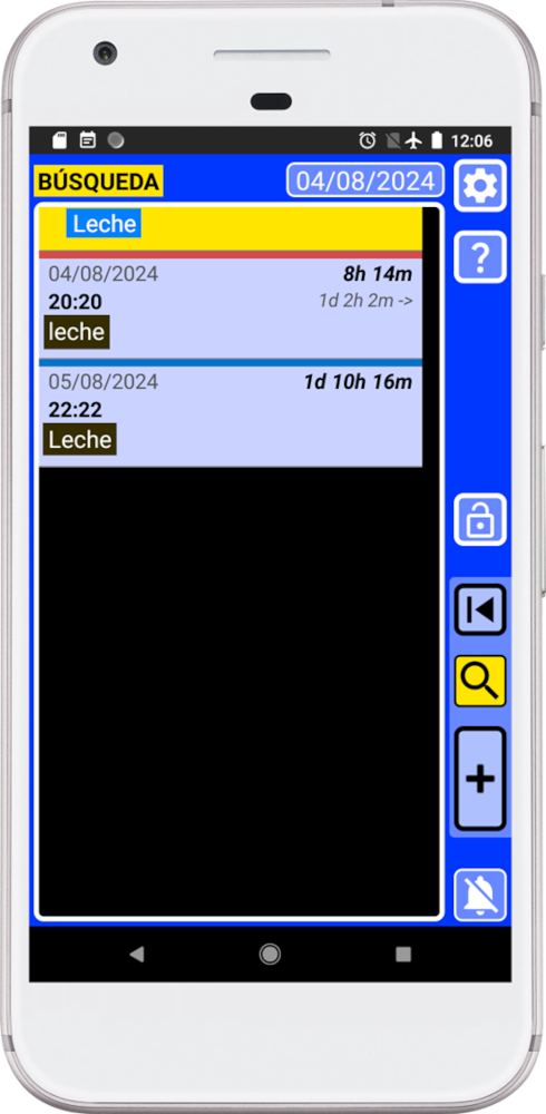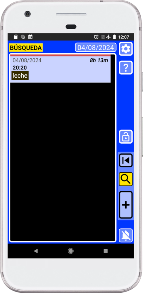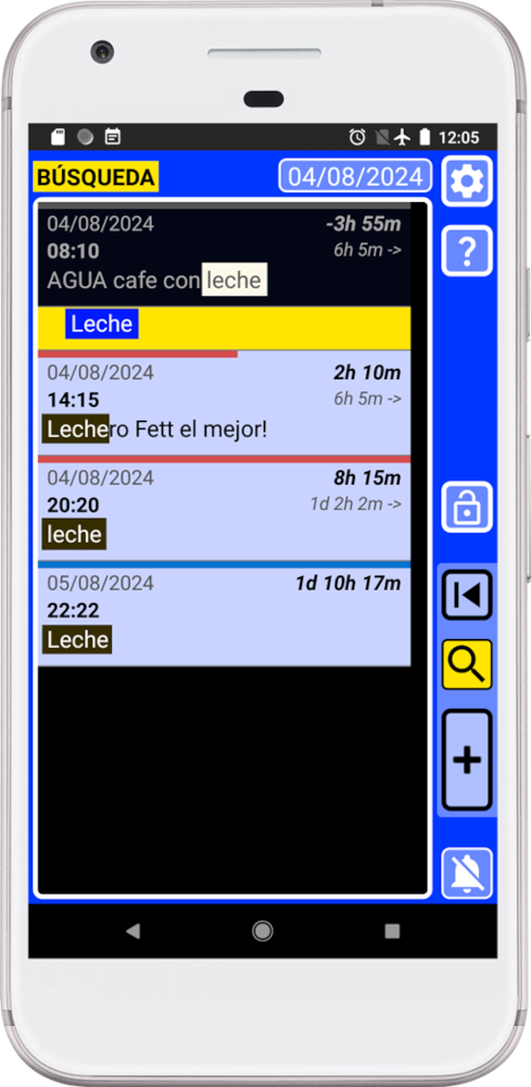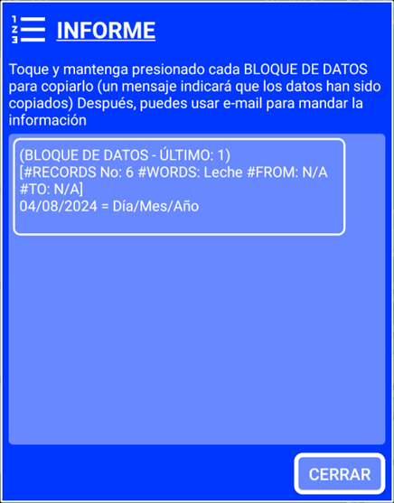 El botón de búsqueda de informes “3” creará un informe con todos los registros para que una persona pueda leerlos. Por ejemplo, si llevas un registro de todo lo que comes y bebes y tienes un problema médico, podrías crear una lista de todo lo que comiste y bebiste recientemente y enviarla por correo electrónico a tu médico. El médico verá una lista que se puede leer sin usar ningún programa especial.