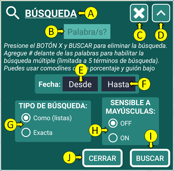 D = Botón para mostrar/ocultar parámetros de búsqueda avanzada.