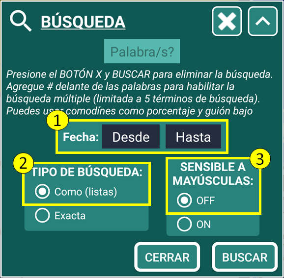 . Exacta = Muestra REGISTROS solo si un REGISTRO COINCIDE EXACTAMENTE con la Palabra/s o combinación de Palabras (con comodines).