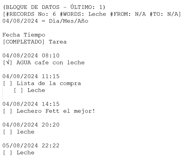 Como podemos ver, tenemos diferentes variantes de la palabra que estamos buscando: “leche”, “Leche”. Debido a que la búsqueda predeterminada te da una vista amplia, podemos ver que muestra todos los registros que contienen “leche”, incluyendo toda la lista donde se encontró “leche” como un artículo.