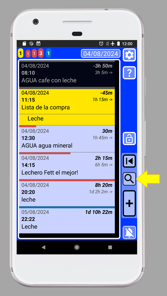 Nota cómo el botón de búsqueda es amarillo y la palabra “BÚSQUEDA” reemplaza los números del contador de tareas (esquina superior izquierda). Esto indica que estamos en modo de búsqueda, lo que significa que la lista no muestra todos los registros (solo muestra lo que estamos buscando).
