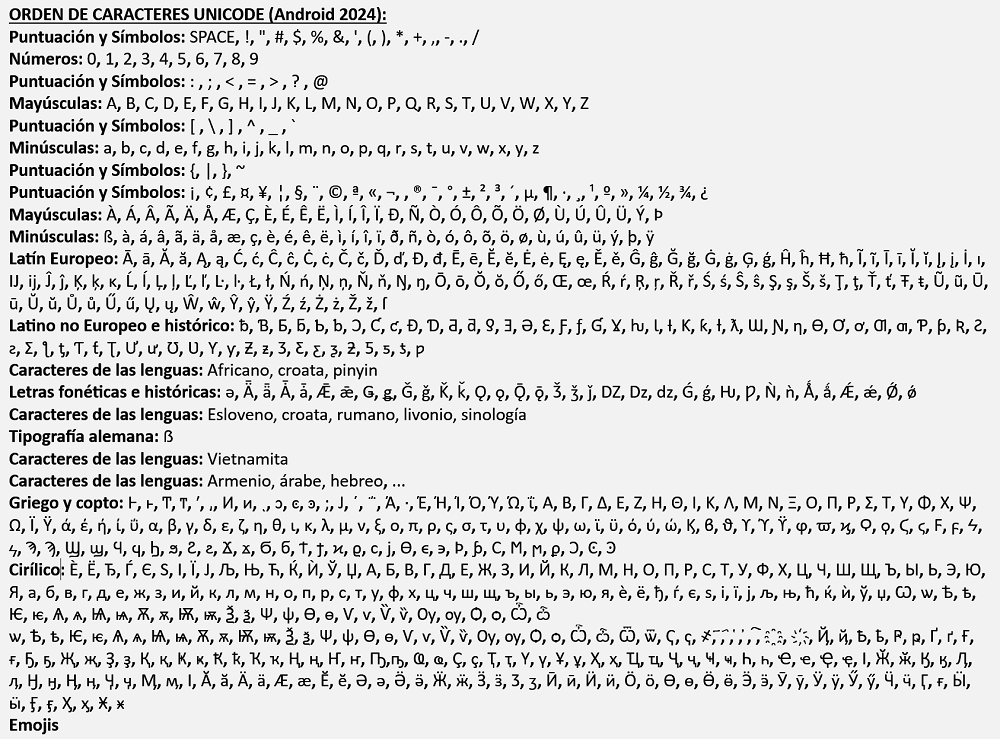 Para resumir, el orden es: espacio, números, símbolos, mayúsculas, minúsculas, mayúsculas con acento, minúsculas con acento, emojis.