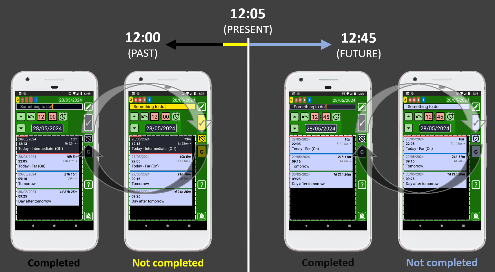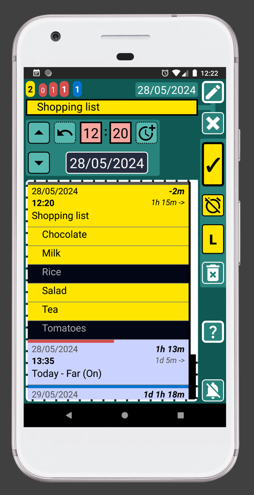 Basically, once you add something to your SECURElogBook it is impossible to forget it! Because the default state of a new record is not completed. Blue with alarm (future), or yellow (past) indicated with notification and yellow counter.