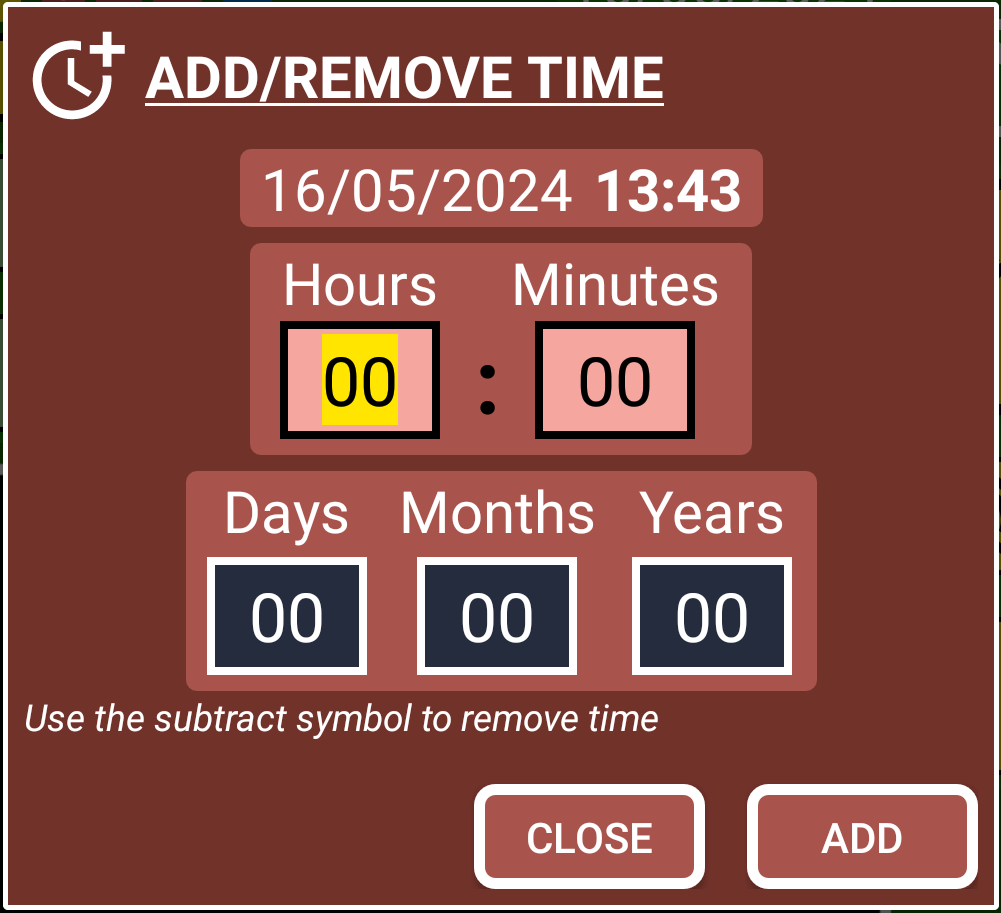 . Window that allows to add or remove time and date values.