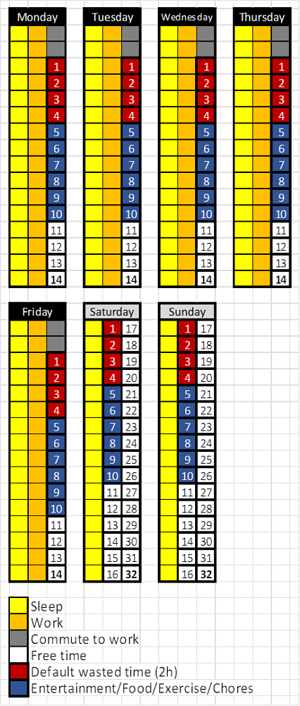Those 19 blocks of theoretical time per day, in reality become 14 time blocks (7h) from Monday to Friday per day. And, on weekends we have 32 time blocks (16h) per day. This means that wasting a block of time from Monday to Friday has a greater impact than wasting it on the weekend, as we have less than half the time blocks per day from Monday to Friday.