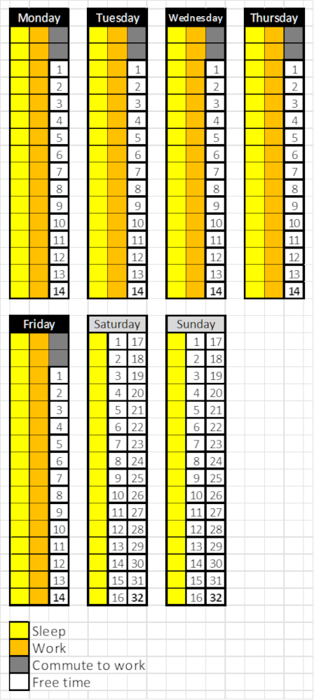 Total hours in a week: 168 Sleeping hours/week: 56 (8h/day) Working hours/week: 40 (8h/day) Commuting to work hours/week: 5 (1h/day)