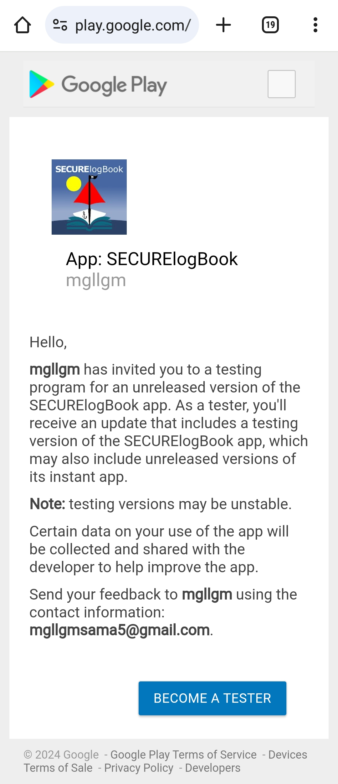 4. Send me that Gmail I will add you to the close test (early access) list. This is my Gmail: mgllgmsama5@gmail.com The easiest way is to send me an email using your phone. This normally will use the Gmail account linked to your Google Play. Add this: I want to participate in Google Play SECURElogBook close test (early access). This will let me know that I need to send you an invitation.
