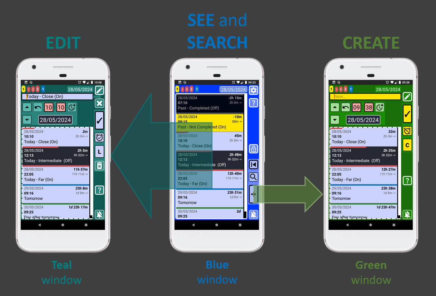 To help you get started, I've created a webpage with manuals, a YouTube channel, and even included a manual within the app itself. I've designed intuitive and logical mechanics to minimize the complexity of this powerful tool. For example, the app uses a visual language that lets you see in advance what each control does. The color of a text box indicates whether it's used for time or dates, and buttons show if they will activate something in the current window or a new one. All buttons are animated and vibrate to give you feedback about what you're doing. Not many apps can do that.