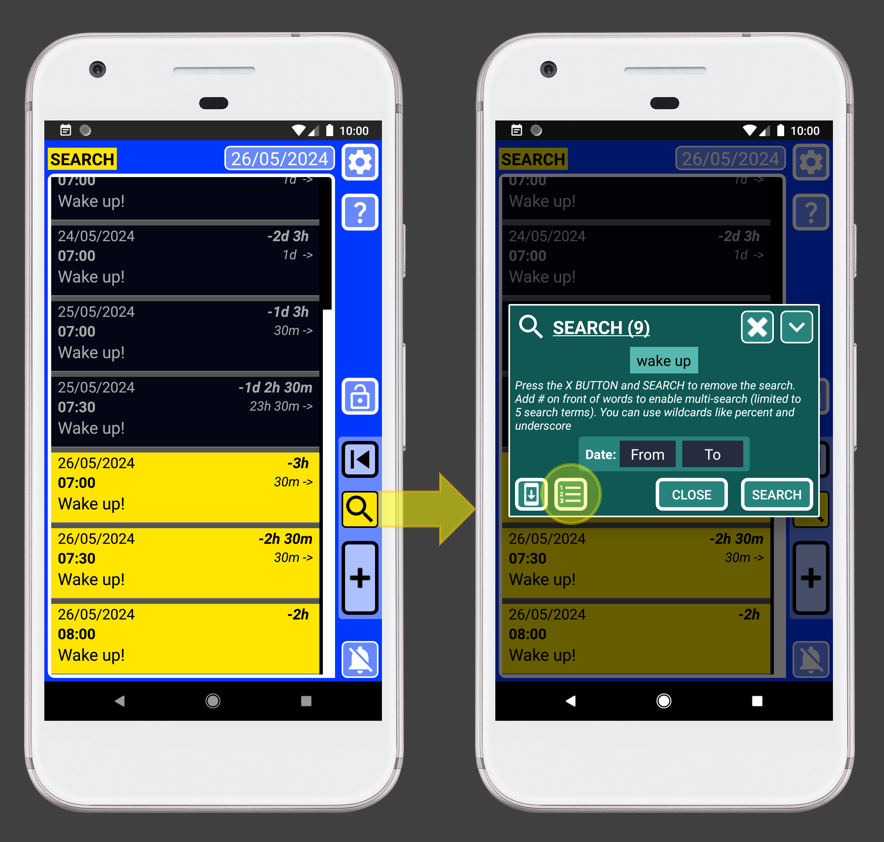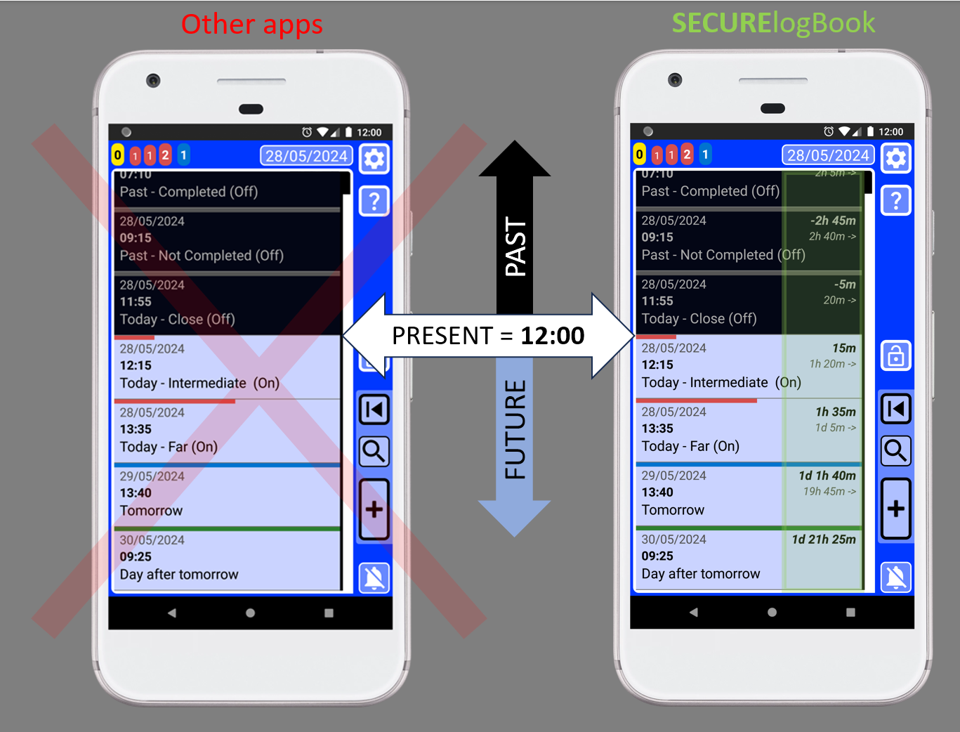 SECURElogBook displays on the right side of every record, the time gap between the present and that record in bold text. And below it, the time between that record and the next record: Same records on both phones. Without relative time values, on the left. With relative time values, on the right.